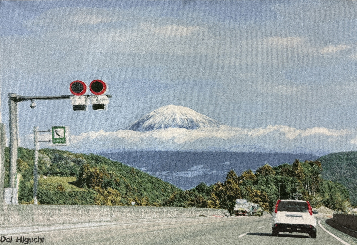 実はこの文章を作成するために調べたことなのですが、作品を作る前に調べておけば、何故富士山を糸で表現しようとしたら難しいのか分かったような気がします。今回は富士山の中腹に雲が横たわって山頂部分がきれいに見えている状態で、日常的に富士山を見ることがない私にとってはとても不思議な光景だったので、作品にしようと思ったのですが、実際の画像では富士山の山肌はもう少し空の色と同化した濃い青色でした。つまり、ほとんど空や雲の色と同じ系統の色なのです。ですから、同系統の色あいで、少しだけ濃く見える糸が選べたら、今より写実性が向上したように思います。しかし、私は過去にも富士山を題材とした作品を作っていて、私の中に富士山のフォト刺繍に使う糸はこの糸だ。という固定観念があります。なので、富士山の山肌部分に使う糸を空や雲の色に対してはっきりとした色合いの糸を選んだのです。
